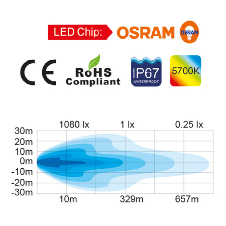 Utrustad med 9 stycken 3W Osram LED-chips och en kombinerad lyskegle, levererar denna lampa en effektiv och jämn belysning. Den är perfekt för både off-road och vägkörning, och den hållbara konstruktionen gör att den klarar även de tuffaste förhållanden.