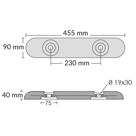 1852, Zinkanod för motorbåt, 7,0 kg, 90 mm x 455 mm, 230 mm hålavstånd