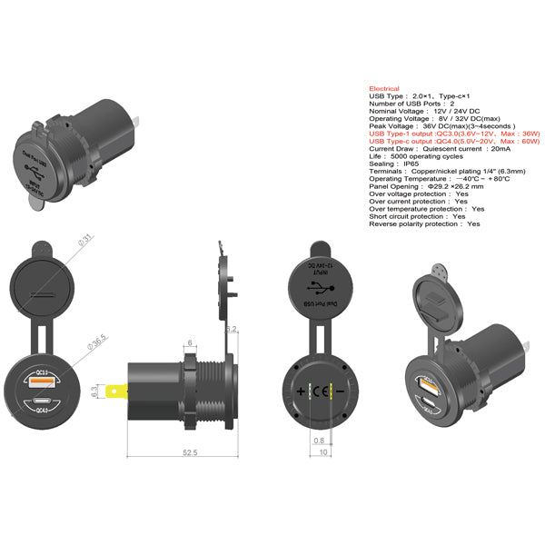Uttaget är utrustat med både USB Type A och USB Type C-utgångar, vilket gör det möjligt att ladda flera enheter samtidigt. Den medföljande 1 meter långa kabeln förenklar installationen, och med IP65-klassningen kan du vara säker på att det står emot både vatten och damm.