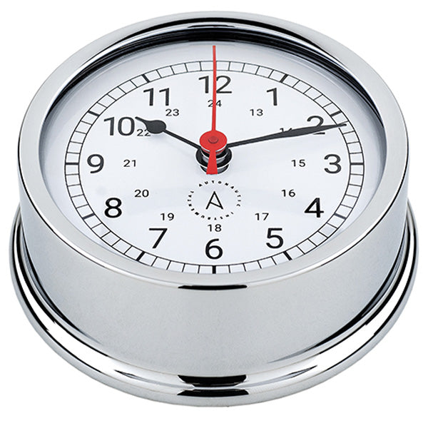 Autonautic Skibsur R95C er en del af Atlantic 95-serien med en base på 95 mm, hvilket giver et elegant og funktionelt design til både og mobile løsninger. Fremstillet i forkromet messing med hvid urskive og beskyttet af mineralglas. Uret drives af præcis Quartz-teknologi (32.786 KHz) og opfylder DIN 8325-standard. Easy Fix System sikrer nem adgang til batteriskift og justering uden afmontering. ISO 9001-certificeret kvalitet.Autonautic Skibsur R95C er skabt til sejlere, der ønsker klassisk design kombineret med moderne funktionalitet. Som en del af Atlantic 95-serien har dette ur en base på 95 mm og en hvid urskive, hvilket giver et elegant og tidløst udtryk til ethvert maritimt miljø. Den forkromede messingkonstruktion sikrer både holdbarhed og stil, mens mineralglasset beskytter mod ridser og slid.