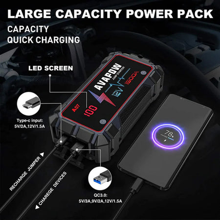 Avapow, Jumpstarter A9, 1500A, 12V, 8000 mAh, IP65, med USB-laddare och LED-lampa