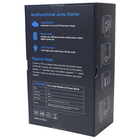 Avapow Jumpstarter A9 erbjuder en säker og effektiv måde at starte dit køretøj på, uanset om det er en bil, en båd eller en ATV. Med en imponerende kapacitet er denne jumpstarter designet til at håndtere op til 7-liters benzinmotorer og 5,5-liters dieselmotorer, hvilket gør den til et uundgåeligt redskab i nødsituationer.