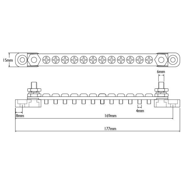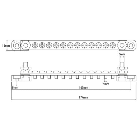 Kopplingsskena: Tennpläterad mässing. Isolerade monteringsfötter i plast 2 x 6 mm-terminaler för ingång. 4 mm rostfria skruvar med specialbrickor. Max 48 volts likström eller 300 volts växelström.Specifikationer
