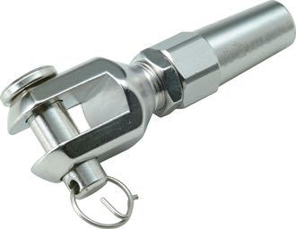 Tillverkad av rostfritt stål, garanterar denna gaffelanslutning hållbarhet och motståndskraft mot belastningar. Med en diameter på 8 mm passar den till de flesta standard stålvire, vilket gör den lämplig för både funktionella och arkitektoniska tillämpningar, såsom att spänna konstruktioner eller för användning i utställningar.