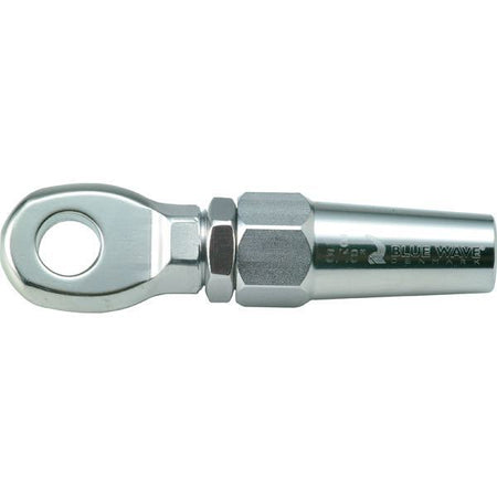 Valsfri ögleterminal i rostfritt stål från Blue Wave. En terminal används för att hålla fast änden av en stålvajer så att vajern bara kan röra sig i en riktning. Den kan t.ex. användas funktionellt för att spänna fast en konstruktion, eller arkitektoniskt för utställningsändamål. Dessutom kan man använda dem för att spänna fast en mast i ett så kallat stag för att stabilisera masten och därmed båten. Terminalerna valsas vanligtvis fast runt stålvajern, dvs. man klämmer ihop terminalen runt stålvajern med hjälp av ett specialverktyg för att hålla fast den till en förankringspunkt. Med valsfria terminaler behöver man inte använda ett specialverktyg. Skruva istället isär terminalen, placera vajern och skruva ihop den igen för att hålla fast stålvajern. Danska Blue Wave tillverkar sina produkter av ett block av rostfritt stål, dvs. det finns inga svetsar och därmed klarar deras produkter extra belastning.Specifikationer