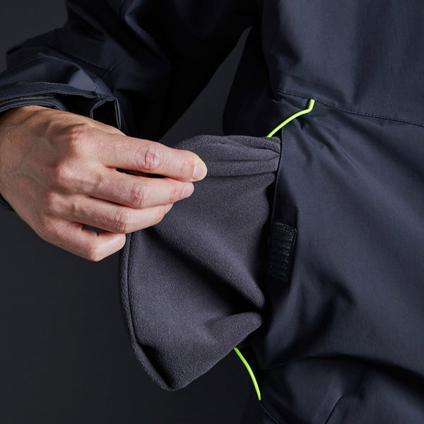 Jackan är tillverkad av ett 2-lagers belagt tyg som är både vattentåligt och ventilerande. De helt tejpade sömmarna säkerställer en vattentät tätning, medan det icke-absorberande och snabbtorkande fodret ger extra komfort. Oavsett om du är till sjöss eller på land, blir denna jacka en pålitlig följeslagare.