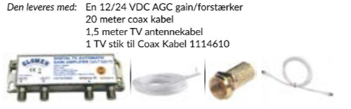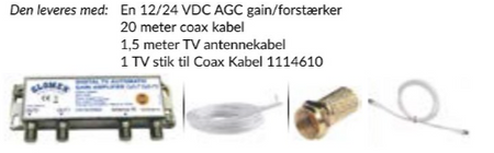 - Ingår: 12/24 VDC AGC förstärkare, 20 meter koaxialkabel, 1,5 meter TV-antennkabel, 1 TV-kontakt för koaxialkabel 1114610