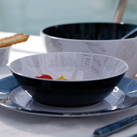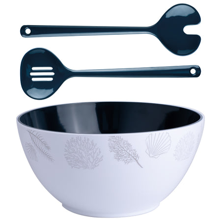 MB Living salatskål Ø25 kombinerer funktionalitet med maritimt design. Den rummelige skål i marineblå og beige med koraldesign er fremstillet af 100% melamin, hvilket gør den særdeles holdbar. Skålen leveres med matchende salatbestik og har en praktisk skridsikker bund.