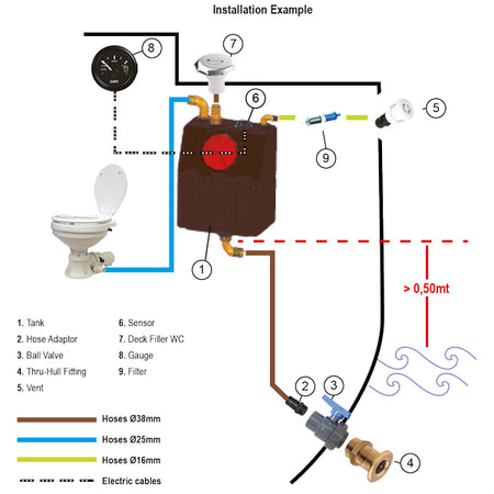 Tillverkad av högdensitetspolyeten, förhindrar tanken lukt och garanterar långvarig hållbarhet. Den är anpassad för montering på båtens skott, vilket sparar värdefullt utrymme. Tanken kan tömmas med hjälp av tyngdkraft, utan behov av pump, när den är installerad mer än 0,5 meter över vattenlinjen.