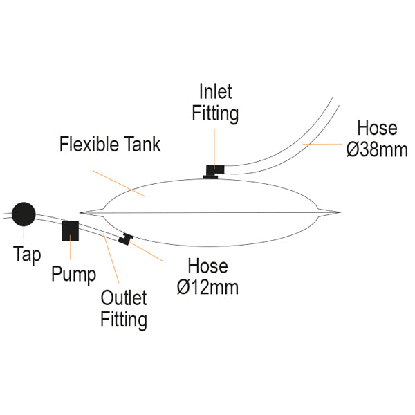 - Kopplingar: Påfyllning 38 mm, avlopp 12 mm