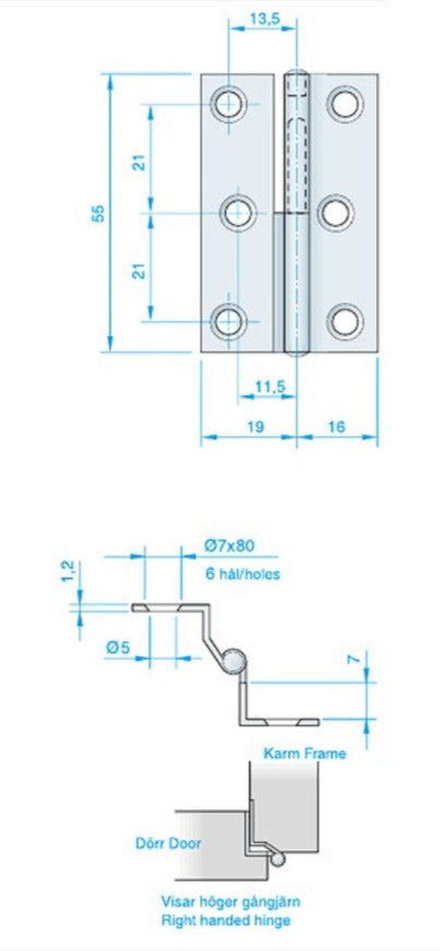 - Gångjärnstyp: Högerhängd