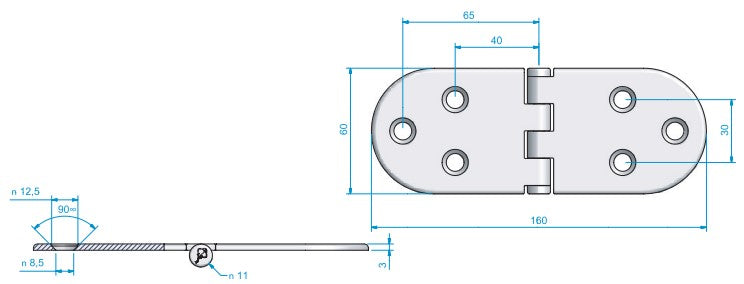 Roca, gångjärn RF 160x60mm, omvänt, AISI 316, rostfritt stål