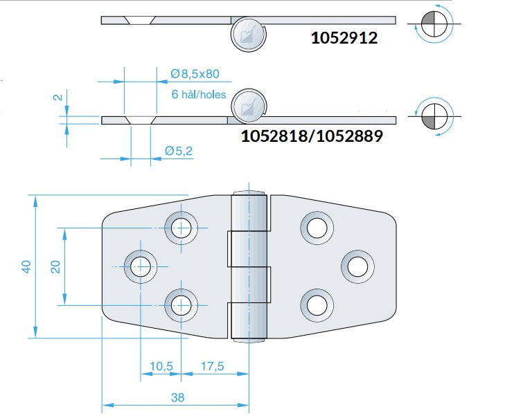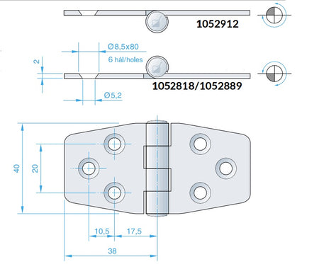 Roca, Gångjärn RF, Rostfritt stål AISI 316, 76x40mm
