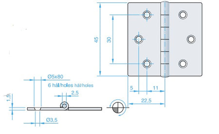 Roca, Kantgångjärn RF, Rostfritt stål AISI 304, 45x45 mm
