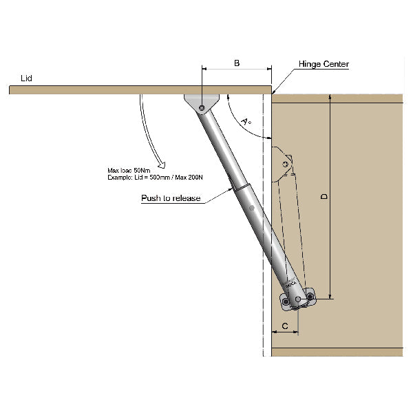 Med en belastningskapacitet på 50 Nm är denna luckhållare perfekt för att hantera både vertikala och horisontella luckor. Enkel installation och intuitiv tryckknapp för stängning gör den till ett praktiskt val för alla användare.