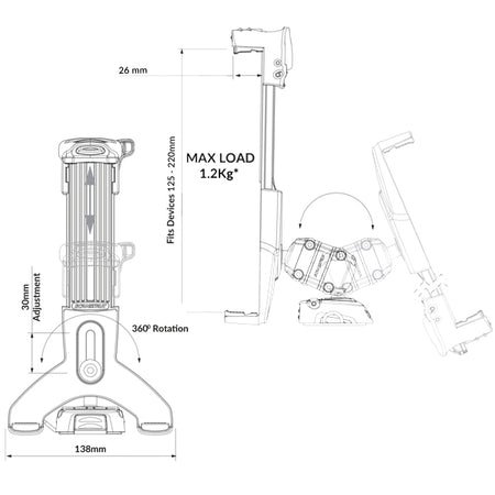 Den justerbara klemmen gör det möjligt att montera både mini- och fullstorleks-tablets. Monteringssystemet är kompatibelt med enheter med en bredd från 125 mm till 220 mm, vilket ger stor flexibilitet för olika tablet-modeller. Den maximala viktkapaciteten på 1,2 kg säkerställer att din enhet är stabil och säker under användning.