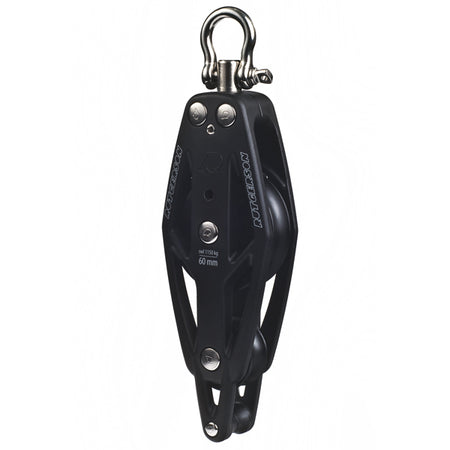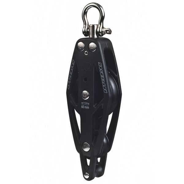 Rutgerson RAW Block 50mm er en højkvalitets violinblok med hundsvot (hundepote), designet specifikt til maritime anvendelser. Denne blok kombinerer sfæriske glidelejre med robuste kompositsider og remskiver, hvilket sikrer både holdbarhed og funktionalitet under krævende forhold på vandet.