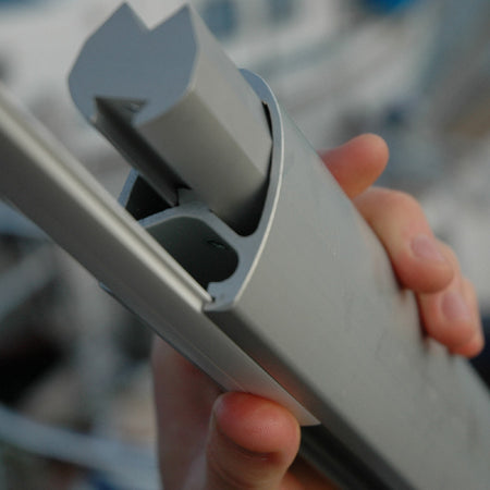 - Justering: Klammer runt akterstaget för justerbar spänning