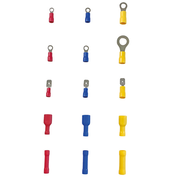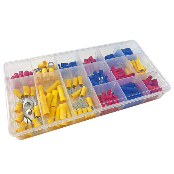 SeaTec, Assortment Box Cable Lug, 150 delar, Innehåller ringplintar, platt stift och skarvkontakt, blå, röd och gul, 10 delar av varje