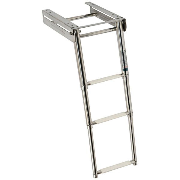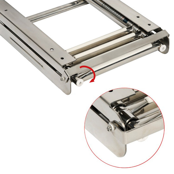 Badstegen är tillverkad av rostfritt stål och har breda, ovala steg med en skridsäker plastbeläggning, vilket säkerställer ett bra grepp under användning. Den teleskopiska designen gör det möjligt att fälla in stegen i en kompakt kassett, som dessutom är utrustad med ett fallskyddslås för extra säkerhet.