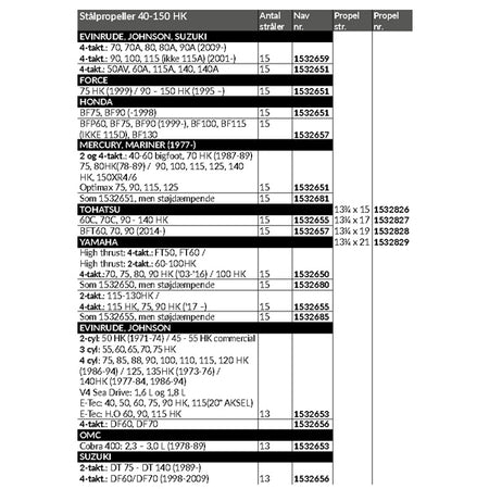 - Motorer: Passar till Evinrude, Johnson, Suzuki, Force, Honda, Mercury, Mariner, Tohatsu, Yamaha, OMC och Suzuki motorer
