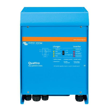 Victron Quattro växelriktare/laddare har samma funktioner som MultiPlus men med en inbyggd nätomkopplare för automatisk växling mellan generatorsystem och landström. Quattro har två ingångar och två utgångar, där den ena utgången endast är aktiv när det är 230 V in. Den kan användas för varmvattenberedare eller andra förbrukare som inte ska försörjas med 230 V från växelriktaren.